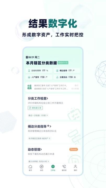 通过工作台,您可以完成指定工作,并获得相应的垃圾分类工作指数,垃圾分类工作指数将是衡量小区分类工作开展情况的重要指标,获取更高的指数将有机会登顶小区排行榜,从而让更多人看到小区的工作!